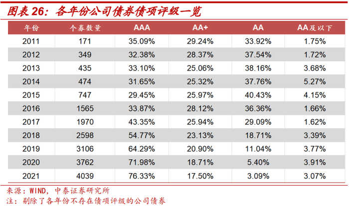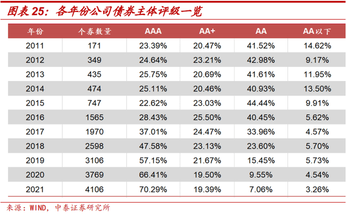 中登公司标准券质押制度的调整或为信用评级整体迁移的重要影响因素。2014年6月,中登公司发布《质押式回购资格准入标准及标准券折扣系数取值业务指引》(2014版),指出足额资产担保不再是信用债券回购资格准入标准,此后主体评级为AA以下(含AA级且评级展望为负面)的债券不再具有入库回购业务资格,债市迎来了第一次评级迁移;2017年4月,中登公司发布《质押式回购资格准入标准及标准券折扣系数取值业务指引(2017 年修订版)》,提出2017年4月7日(不含)后公布募集说明书的信用债券入库开展回购,需满足债项评级为AAA级、主体评级为AA级(含)以上要求,至此,开展质押式回购业务的债券门槛已经达到债项评级AAA级,债市迎来了第二次评级迁移。如下图,在各年份公司债券主体评级一览中,我们可以观察到2014年以后AA级及以上公司债券占比显著提升;在各年份公司债券债项评级一览中,同样可以观察到2017年以后AAA级公司债券占比显著提升。