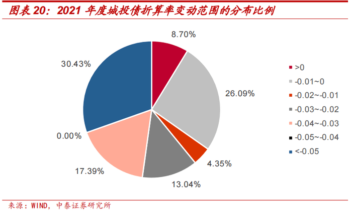 从城投债来看,本次研究共涉及到111个城投主体。从债券折算率的平均变动幅度情况来看,上调幅度超过0.10的企业仅有天津泰达投资控股有限公司1家,变动幅度为0.11,主要由2020年折算率水平偏低回调导致;下调幅度超过0.30的企业有4家,其中江油鸿飞投资(集团)有限公司的变动幅度最大、为-0.26。