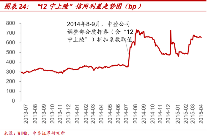 历次质押率调整造成了部分低资质债券信用利差的走阔。在之前,低信用评级债券可以通过杠杆倍数进一步放大收益率,投资者因此降低了对低信用评级债券的收益预期。但中登公司关于标准券质押制度的调整,一直在提高债券开展入库回购业务的资格门槛,低信用评级债券折扣系数逐次降低甚至失去质押回购资格。例如,债券“12宁上陵”在2014年8-9月中登公司宣布调整折扣系数取值后,信用利差迅速走阔至700bp。