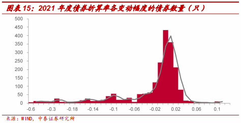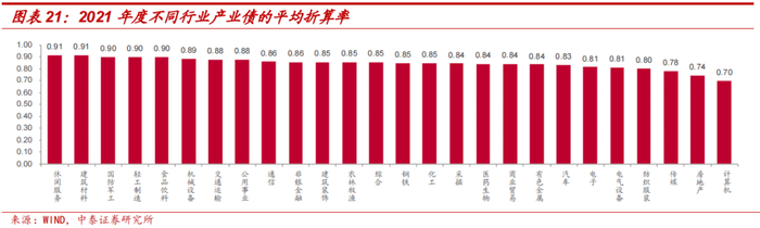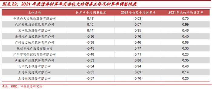 分行业看产业债折算率的变动情况:从平均折算率情况来看,2021年间,休闲服务、建筑材料行业的产业债折算率较高,均为0.91;传媒、房地产、计算机行业的产业债折算率较低,分别为0.78、0.74和0.70。