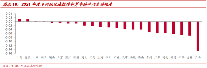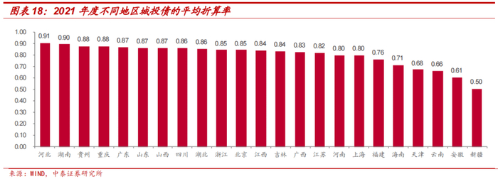 分省份看城投债折算率的变动情况:从平均折算率情况来看,2021年间,河北、湖南地区城投债折算率较高,分别为0.91和0.90;安徽、新疆地区城投债折算率较低,分别为0.61和0.50。