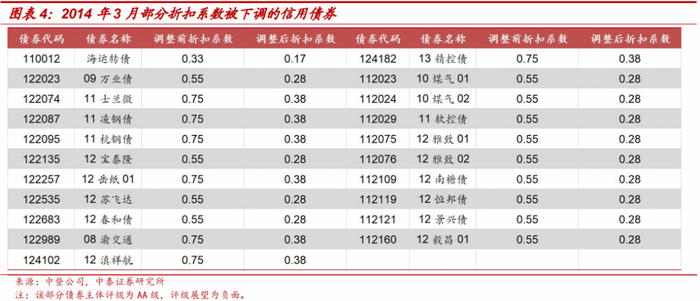 2014年3-5月,中登公司两次发文下调主体评级为AA,评级展望为负面的信用债券折算率。此后,该部分存量债券陆续被清理完毕。中登公司3月发布《关于调整部分回购质押券折扣系数取值的通知》[6],将主体评级为AA、评级展望为负面的债券折扣系数在原基础上下调了50%;5月再次下调为0[7]。这两次中登公司质押规则的调整主要针对特定类型债券,而非债券市场整体,相对而言影响有限。但主体评级为AA,评级展望为负面的信用债券质押率在原基础上先被下调了50%,其后被直接下调为0,这些债券的持有者因此承受了一定的政策调整风险。