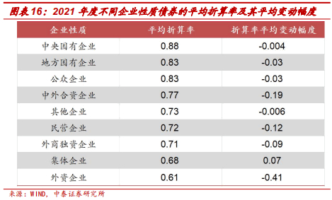 分企业性质看债券折算率的变动情况:从平均折算率情况来看,2021年间,国有企业发行债券的平均折算率较高。其中,中央国有企业的债券平均折算率最高、为0.88;地方国有企业的债券平均折算率次之、为0.83;非国有企业的债券平均折算率较低、为0.75。在非国有企业中,外资企业的平均折算率最低、仅为0.61;公众企业的平均折算率相对较高、为0.82,与地方国有企业接近。