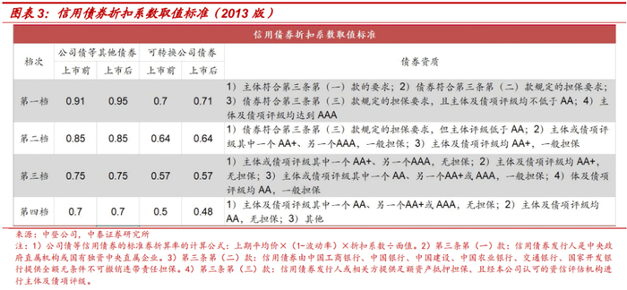 2013年之前,中登公司并没有采取对各类资质信用债券分别确定具体折扣系数的操作方法。例如,在2004年发布的《标准券折算率管理办法》[2]中,中登公司直接规定上市前、后的信用债券标准券折算率分别为94%、90%;在2012年发布的《标准券折算率管理办法》[3]中,中登公司确定信用债券折算率采用“折扣系数取值区间”的操作方法,规定上市前、后的信用债券折扣系数取值区间分别为【70%,91%】、【70%,95%】,区间范围内的具体取值由中登公司根据相关债券的评级及担保等具体情况确定后通告证券交易所,继而向市场公布。