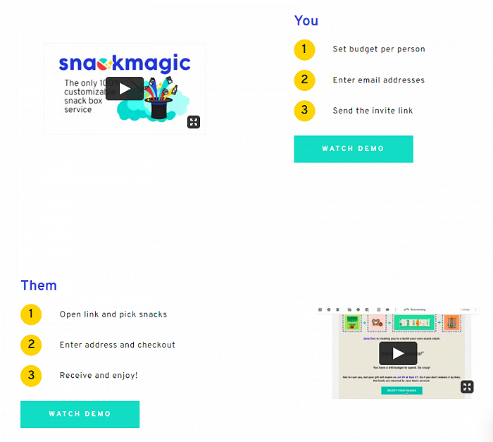 Snack Magic操作非常简单。你只需要设置每个人的预算,留下他们的邮箱,然后发送给收件人链接。无论订阅者想要给一个人还是100000人送礼物,每个收件人都可以自由的通过链接从Snack Magic的零食库中筛选更符合自己胃口的零食,组成完全个性化的盒子,由Snack Magic组装寄送。Snack Magic是唯一一家可以让收礼物的人自己选择,选择他们能得到什么样礼物的服务商,从根本上让送礼物变得双赢。