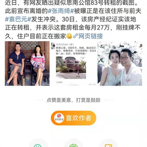 上一次名叫思南公馆的小区出现在娱乐新闻中,还是张雨绮与前夫袁巴元离婚时。据凤凰娱乐消息,2018年,张雨琦与前夫袁巴元协议离婚,被曝离婚后搬家。房产中介证实公寓转租,当时租金是每月27万。而两人离婚导火索,有传是与房产、钱财问题有关。