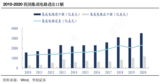 半导体行业本身具有相当的深度和广度,支持着该行业长周期上高景气的确定性和持续性。其上游为半导体支撑业,包括半导体材料和半导体设备;中游按照制造技术分为分立器件和集成电路;下游为消费电子、计算机、通信、汽车、工业、新能源等终端产品。当前,在国产替代趋势驱动下,中国半导体不仅市场增速远高全球,产品也开始走出国门。根据海关统计数据,2010年,中国集成电路进口额为1569.9亿美元,出口额为292.5亿美元;2020年,中国集成电路进口金额3500.4亿美元,出口金额1166亿美元。从2010年到2020年,我国作为半导体产业绝对大头的集成电路的贸易逆差持续扩大,并于2018年首次突破了2000亿美元大关,国产化箭在弦上。