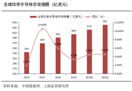 此外,2020年以来,疫情下远程办公催生出来的对于PC和服务器的强劲需求,叠加“双碳”政策下新能源汽车扩产和光伏发电的需求井喷,功率半导体供不应求。作为新能源车、光伏和半导体的最大公约数,功率半导体增长确定性高,未来发展高度可预期。根据IHS统计,2019年全球功率半导体市场规模约为404亿美元,预计到2021年全球市场规模将增长至441亿美元,CAGR达到4.09%。
