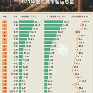 2021年,客运总量排名前十的城市分别是北京、上海、广州、重庆、深圳、成都、武汉、西安、杭州和南京。其中北京、上海客运总量独超50亿人次,稳居全国第一方阵。