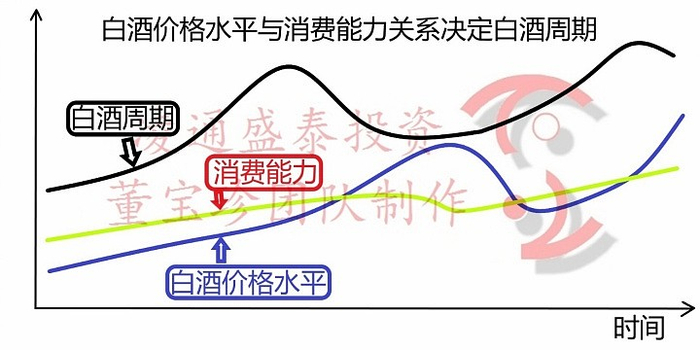 白酒周期本质原因是,消费者的消费能力与白酒价格之间的矛盾和关系导致的。如果白酒的价格和消费者的购买能力保持大体的一致,这时行业就会处于稳定的适度增长状态。如果白酒厂基于急功近利的人性过度提高出厂价格,这时就会出现相对于消费能力的价格泡沫。在价格泡沫大到一定程度,消费能力无法再支持高价格需求快速萎缩,供给过剩,于是行业下行拐点随之来临,产业进入衰退期。当行业进入衰退期后,白酒企业被迫降价,被迫促销,于是价格水平降到了消费者消费能力可承受的范围,甚至还低于消费者的消费能力,这样就会出现白酒的需求爆增供快速地消化渠道库存,白酒再次进入上升周期。