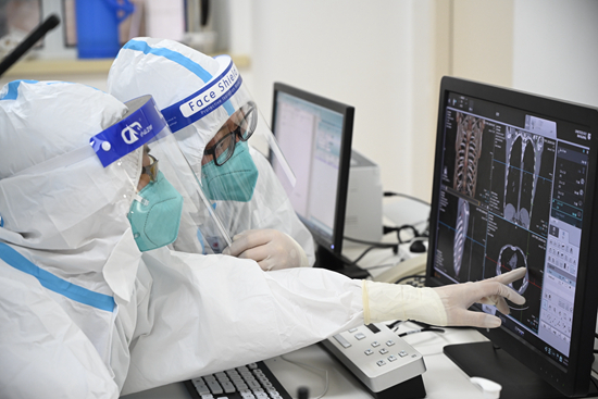 北京冬奥会测试赛期间,申建宇(右)正在与同事一起查看伤患的CT影像资料。