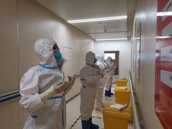 崇礼院区急诊科医护人员练习穿脱防护服。