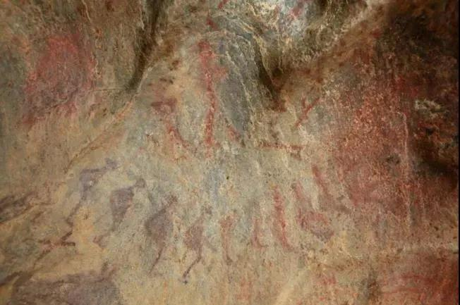 岩画上有一排7人,其中4人尾随牛马等动物,3人弯腰撅臀,手持木棍,专家学者称此为单杆,脚下踩着长条形物件极似滑雪板,此岩画就是阿勒泰人单杆滑雪狩猎的场景