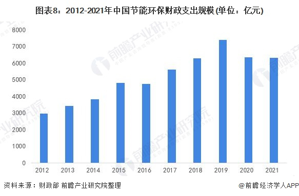 近年来,国家在财政支出方面,把生态环保、绿色发展作为重要的领域,财政支出逐步扩大。据财政部数据,2012-2021年,全国节能环保财政支出规模年均增长率达8.8%。从波动趋势来看,2012-2019年,我国节能环保财政支出规模整体呈扩大趋势,2020-2021年有所下降。2021年,全国节能环保财政支出规模达6305亿元。