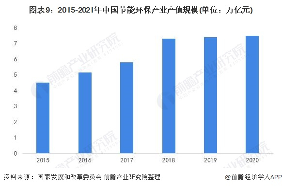 在国家政策和财政支出的推动下,我国节能环保产业快速发展。据发展和改革委员会公布数据,“十三五”期间,节能环保产业产值由2015年的4.5万亿元上升到2020年的7.5万亿元左右。