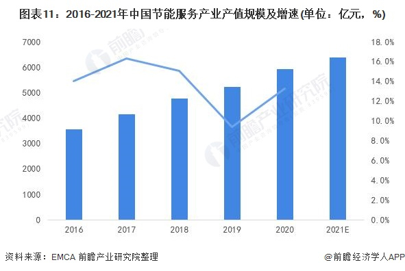 随着国家及地方政策的不断推进,我国节能服务产业不断发展,产业总产值不断增长,呈逐年上涨趋势。据中国节能协会节能服务产业委员会(EMCA)数据显示,2020年我国节能服务产业总产值达5917亿元,同比增长13.3%。