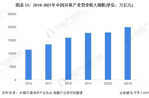 《中国环保产业发展状况报告(2020)》采用环保投资拉动系数法、产业贡献率和产业增长率三种方法预测2020年环保产业营业收入规模大约在1.6万-2万亿元之间,2021年环保产业规模有望超过2万亿元。