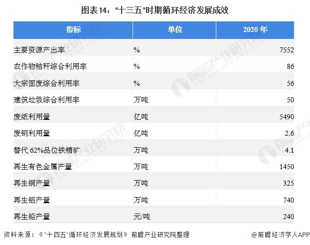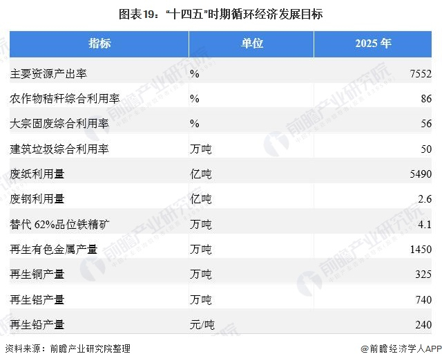 据《“十四五”循环经济发展规划》,到2025年,主要资源产出率比2020年提高约20%,单位GDP能源消耗、用水量比2020年分别降低13.5%、16%左右,农作物秸秆综合利用率保持在86%以上,大宗固废综合利用率达到60%,建筑垃圾综合利用率达到60%,废纸利用量达到6000万吨,废钢利用量达到3.2亿吨,再生有色金属产量达到2000万吨,其中再生铜、再生铝和再生铅产量分别达到400万吨、1150万吨、290万吨,资源循环利用产业产值达到5万亿元。