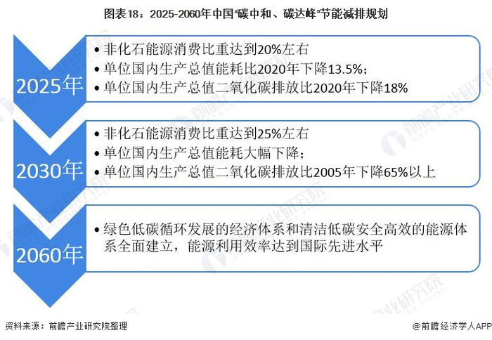 据我国“碳中和、碳达峰”节能减排规划——《关于完整准确全面贯彻新发展理念做好碳达峰碳中和工作的意见》和《2030年前碳达峰行动方案》,到2025年,绿色低碳循环发展的经济体系初步形成,重点行业能源利用效率大幅提升。单位国内生产总值能耗比2020年下降13.5%;单位国内生产总值二氧化碳排放比2020年下降18%。