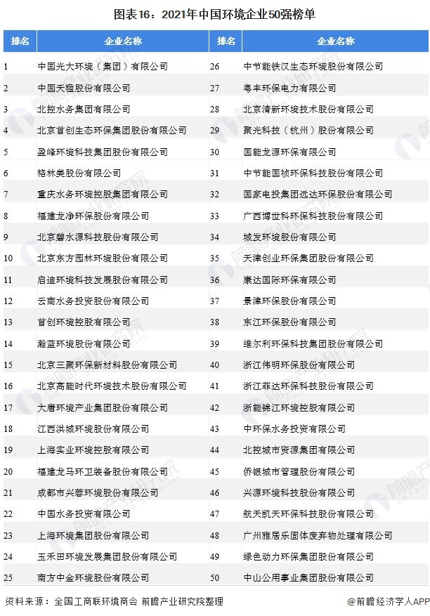 从企业竞争来看,我国节能环保产业的企业数量众多,以中国环境企业50强为例,根据全国工商联环境商会发布的“2021中国环境企业50强”榜单,A股上市公司33家,港股上市公司10家,新加坡上市公司1家,非上市公司6家。