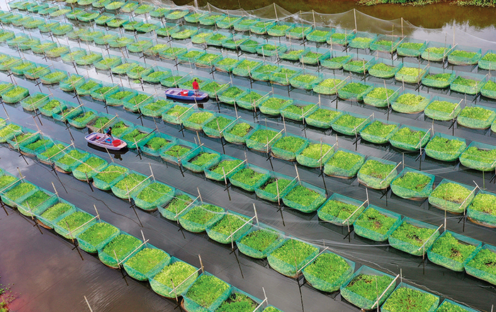 2021年6月15日,湖南省衡阳市衡南县向阳桥街道天竺村,村民给养殖的鳝鱼投喂饵料 曹正平摄/本刊