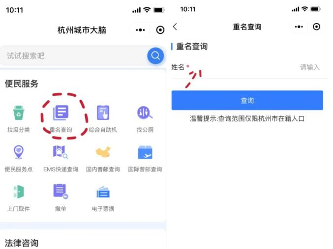 点击杭州城市大脑-杭州发布·小程序,找到“重名查询”输入需要查询的名字即可。