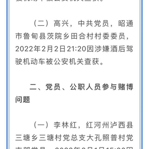 2月8日,云南省纪委监委公开曝光了4起党员、公职人员涉嫌酒驾、赌博问题的典型个案,包括普洱市镇沅县者东镇中心小学教师张志刚、昭通市鲁甸县茨院乡田合村村委委员高兴酒后驾驶机动车和红河州泸西县三塘乡三塘村党总支大孔照普村党支部党员李林红、昭通市巧家县包谷垴乡青山村卫生室村医施秀文赌博案件。