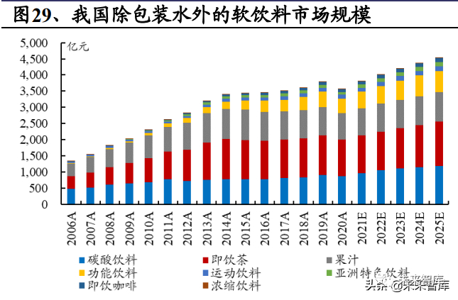除包装水外的软饮料市场规模依然庞大,且品类多种多样。根据 Euromonitor, 2020 年我国除包装水外的软饮料市场规模已达至 3,577 亿元,2013-2020 年复合增 速为 0.7%。在其他软饮中,主要品类为即饮茶、碳酸饮料、果汁及功能性饮料, 2020 年市场规模分别为 1,126 亿元、875 亿元、822 亿元及 448 亿元;2013-2020 年复合增速分别为-0.2%、1.0%、-0.6%及 5.9%。根据 Euromonitor,预计 2025 年 除包装水外的其他软饮料规模将达至 4,529 亿元,2021-2025 年复合增速将为 2.9%;其中,即饮茶、碳酸饮料、果汁及功能性饮料 CAGR 分别为 2.8%、3.5%、 1.1%及 4.6%,未来 5 年行业整体规模再增近 1000 亿元。我们认为,饮品的年轻 化及时尚性定位将成为各细分赛道高成长的关键。