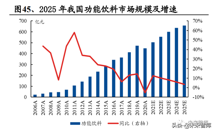 具有激活换新、提神醒脑的功能性饮料正占据时尚饮品的潮流风口。根据 Euromonitor 预计,2025 年我国功能性饮料规模将达至 658 亿元,2021-2025 年 CAGR 约为 4.6%,是除包装水外增长最快的赛道。此外,即饮茶和咖啡仍将保持 较快成长势头,运动饮料也将稳步发展。根据 Euromonitor 预计,2025 年我国即 饮茶、咖啡及运动饮料规模分别将达至 1372 亿元、124 亿元及 146 亿元,2021-2025 年 CAGR 分别为 2.8%、3.7%及 2.9%。(报告来源:未来智库)