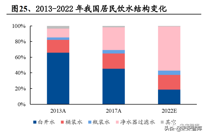 重水质,买品质。随着我国居民的健康生活意识增强,对饮用水水质要求提高, 饮水结构逐渐发生改变。由于包装水具有更安全更健康的特性,愈发成为居民日 常饮水的选择。根据华经产业数据,2013-2017 年,我国居民家用桶装水消费结构 从 16.4%提升至 19.7%。2020 年新冠疫情后,由于健康饮水需求迫切,居民对于包装水的偏好进一步提升。由于饮水品质备受关注,居民桶装水在日常饮用水中 的占比将逐步增加。