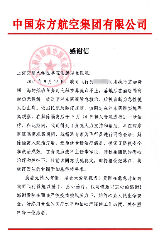 “感谢瑞金医院对我们的大力支持,在疫情特殊情况下,果断接受我们的急性白血病飞行员,并且全心救治,太感谢了!”东航有限公司董事、党组副书记唐兵致意。2月8日中午,中国东方航空集团有限公司(以下简称“东航”)一行来到瑞金医院,送上锦旗和感谢信,表达了诚挚的谢意。