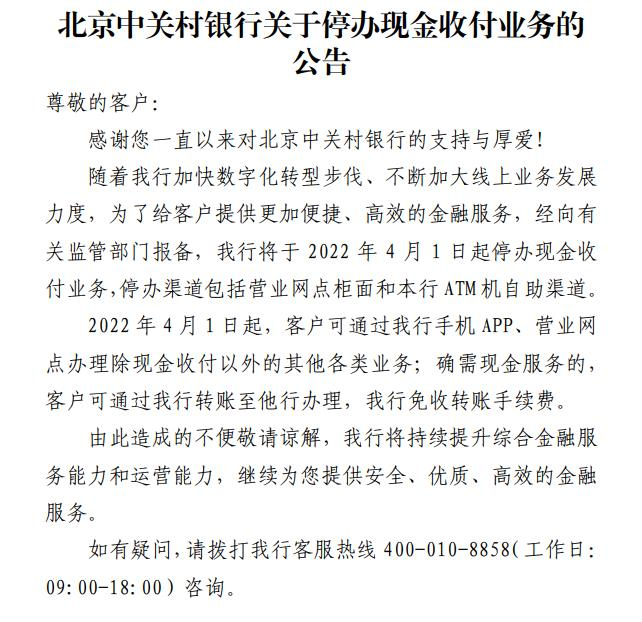 其中,辽宁振兴银行发布停办柜面和ATM现金业务的公告,经主管人民银行批复,从2022年3月1日起,停办柜面现金存取款、零钱兑换、残损币兑换、ATM存取款等现金业务。北京中关村银行发布关于停办现金收付业务的公告,经向有关监管部门报备,将于2022年4月1日起停办现金收付业务。