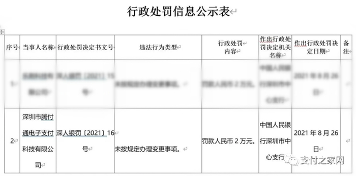 行政处罚决定书文号“深人银罚〔2021〕16号”显示,深圳市腾付通电子支付科技有限公司存在“未按规定办理变更事项”的违法行为,中国人民银行深圳市中心支行对其罚款人民币2万元。此次处罚,作出行政处罚决定日期为2021年8月26日。