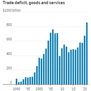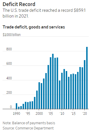 2月8日周二,美国商务部公布的数据显示,2021年美国商品和服务贸易逆差增加26.9%至8591亿美元,创历史新高,远超2006年创下的7635.3亿美元的纪录。