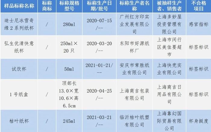 1批次一次性纸餐饮具感官指标不合格。不合格样品为由上海多妙屋投资管理有限公司销售、标称由广州红方印实业发展有限公司生产、标称名称为”迪士尼冰雪奇缘2系列纸杯”(生产日期/批号为2020-07-15)。对此,上海市市场监管提醒消费者,虽然很多纸杯都印有漂亮的图案,但是根据国家标准GB/T 27590-2011《纸杯》规定:“杯口距杯身15mm内、杯底距杯身10mm内不应印刷”。