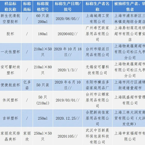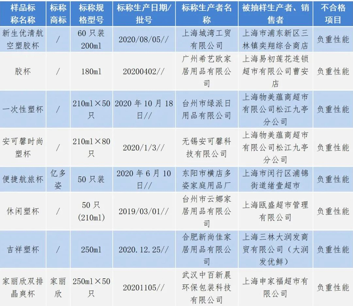 8批次产品被检测出负重性能不合格。如上海市浦东新区三林镇奕翔综合商店销售、标称由上海城湾工贸有限公司生产、标称名称为“新生优清航空塑胶杯”(生产日期/批号为2020/08/05)及上海易初莲花连锁超市有限公司曹安店销售、标称由广州希艺欧家居用品有限公司生产的胶杯(生产日期/批号为20200402)等。