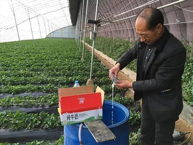 到了草莓的生长阶段时,培育员还会用牛奶和红糖稀释后进行灌溉,可以加强土壤中的有益菌群,给草莓苗提供了优良的土壤环境。