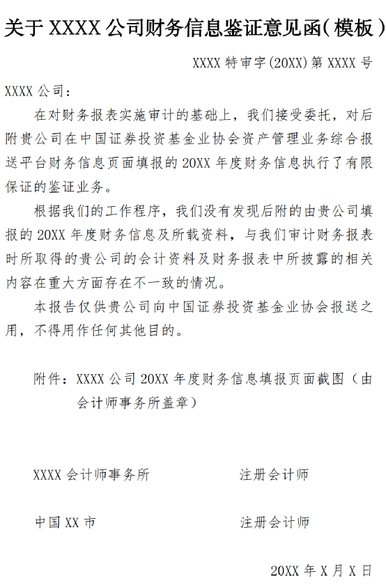 《通知》表示,针对第(二)类经营异常机构,协会将要求其出具专项法律意见书。此类私募基金管理人在AMBERS系统提交历年未提交的年度财务报告时需同时上传经中国证监会备案的会计师事务所出具的鉴证意见函(鉴证意见函模板详见附件1)。