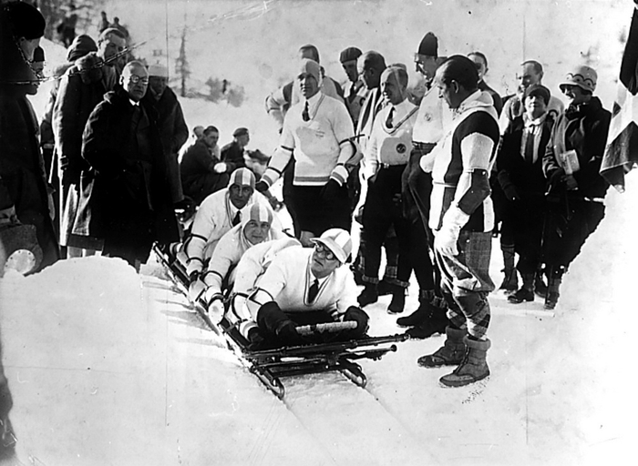 1932年2月16日,美国普莱西德湖,第三届冬奥会,美国队获四人有舵雪橇项目冠军,队员代表菲斯克上前领取奖杯。