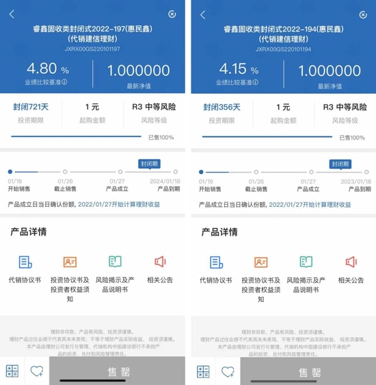 此外,建信理财“睿鑫固收类封闭式2022-194(惠民鑫)”也于1月19日开售,北相通理财产品,1元起购,封闭356天,业绩比较基准4.15%,截至1月22日,该产品已经售罄。