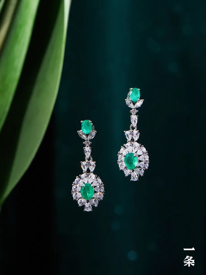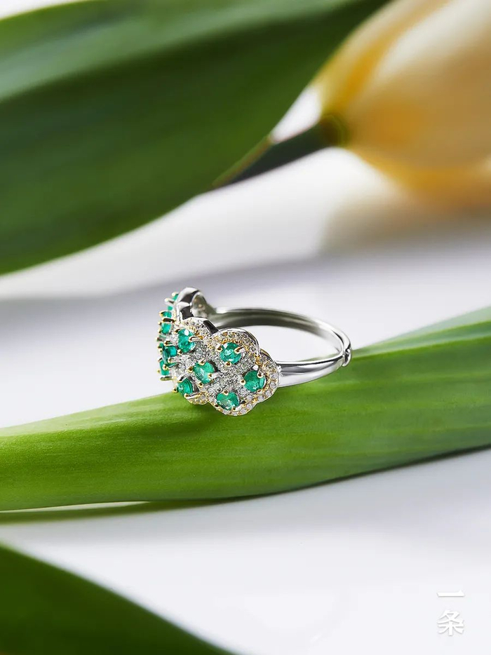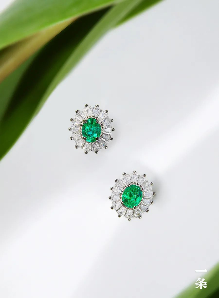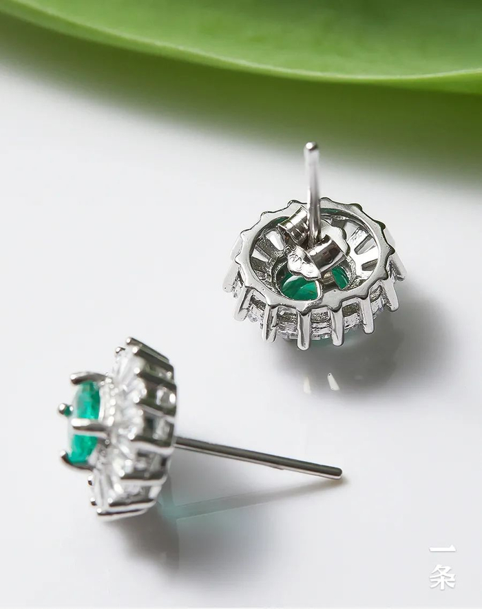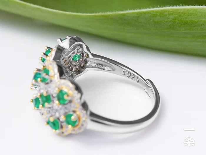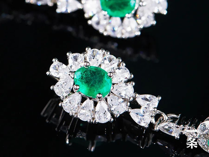 祖母绿宝石做花心,环绕锆石,火彩光芒加倍闪烁,清冷又热烈。