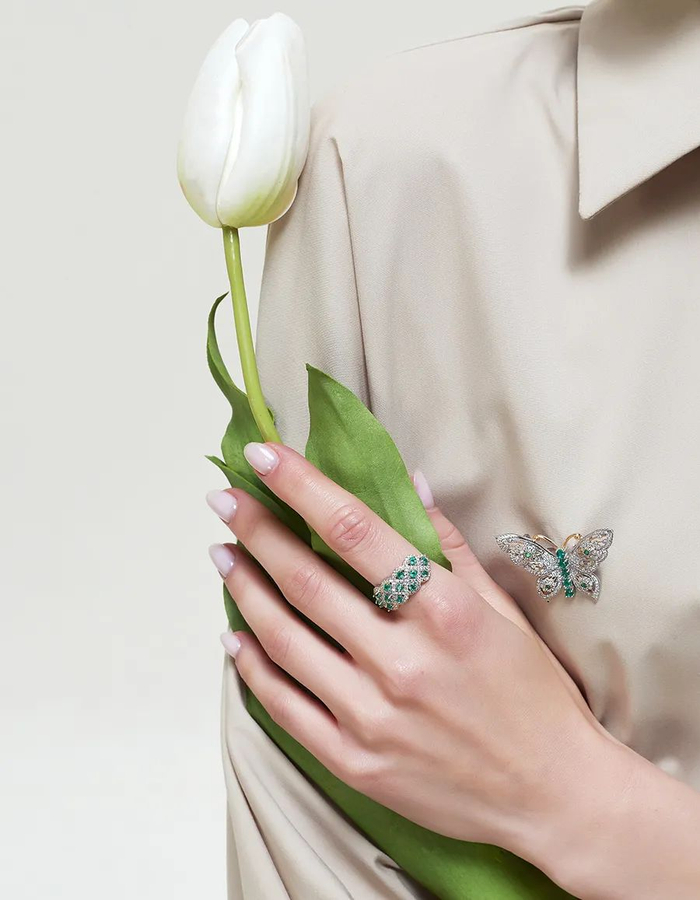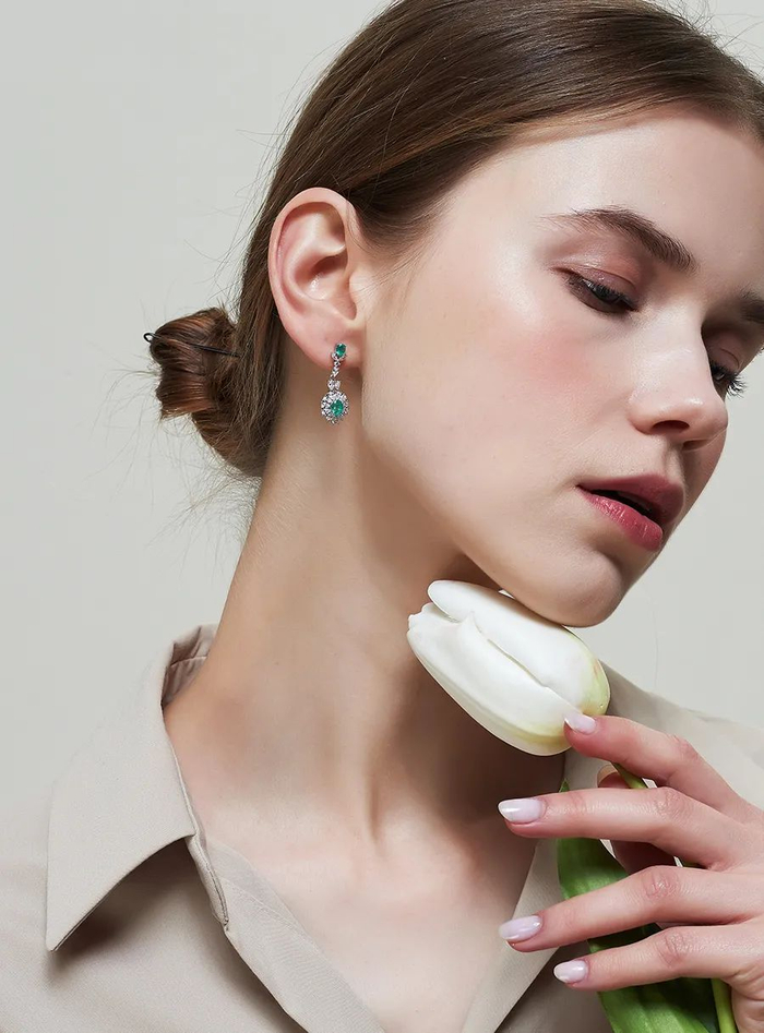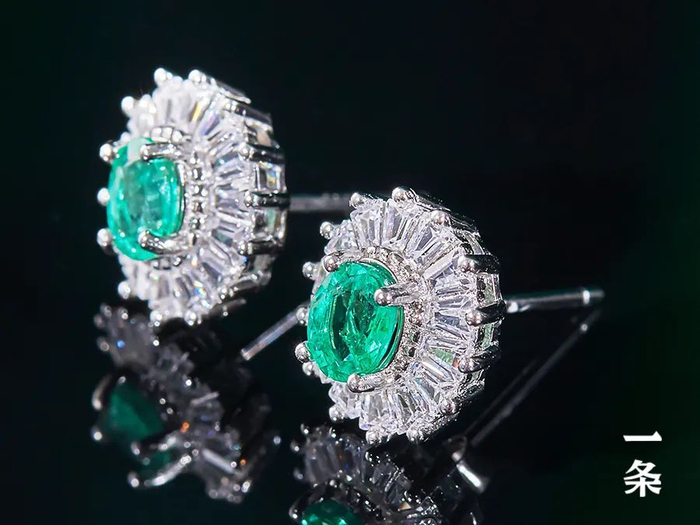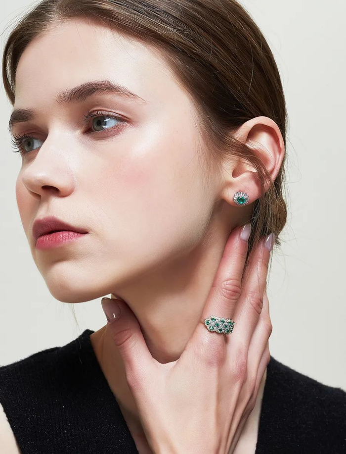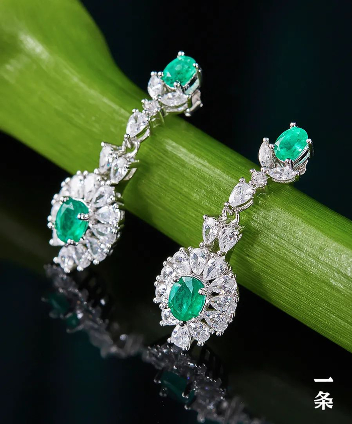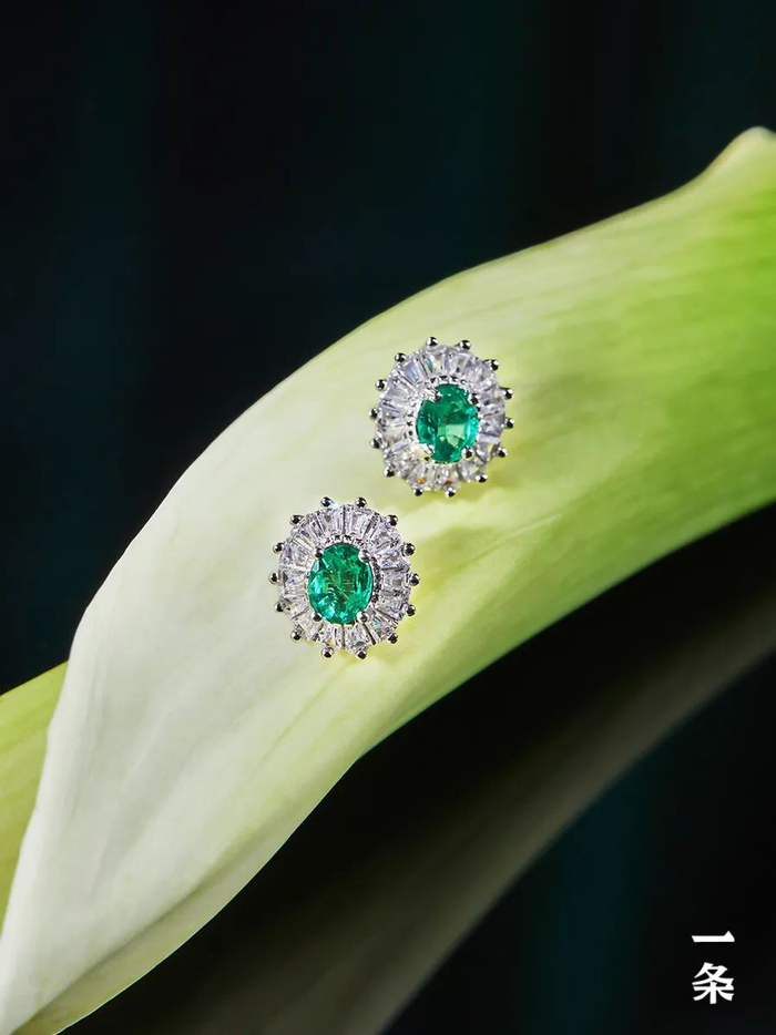 祖母绿宝石做花心,环绕锆石,火彩光芒加倍闪烁,清冷又热烈。