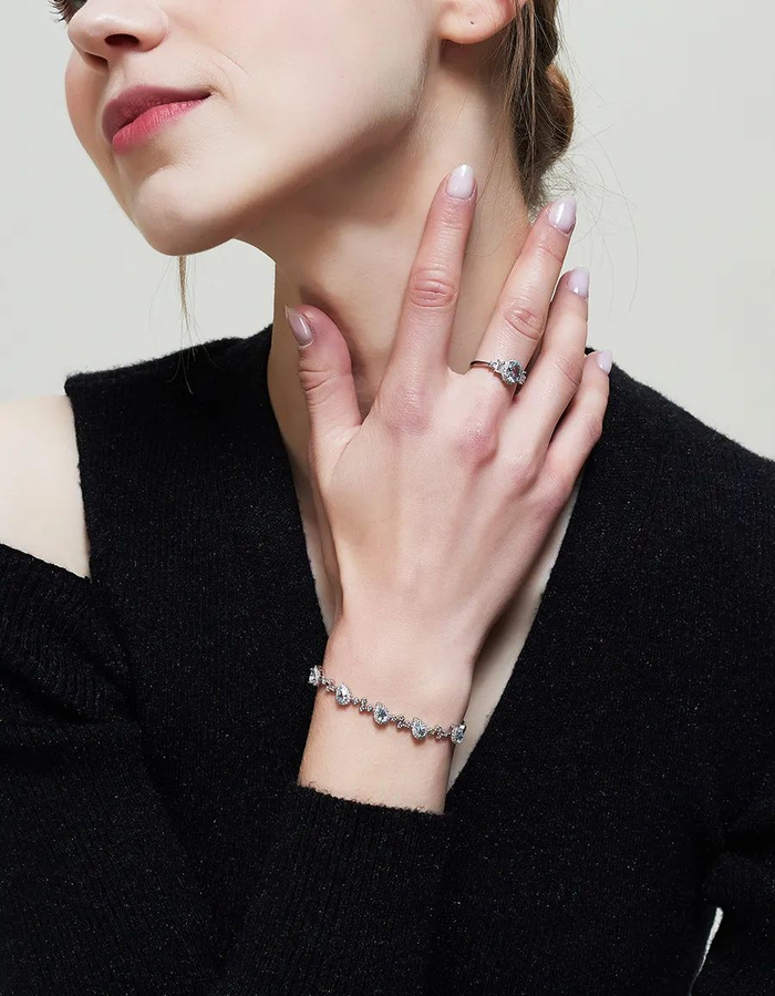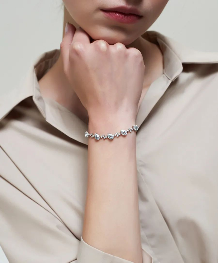 中间又以水滴形的白锆石过渡,凸显出璀璨光芒,又呼应了“水”的主题。