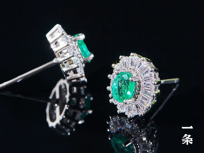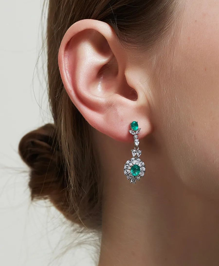 上下两颗祖母绿宝石遥遥呼应,颜色浓艳青翠,看一眼就忘不了的美。