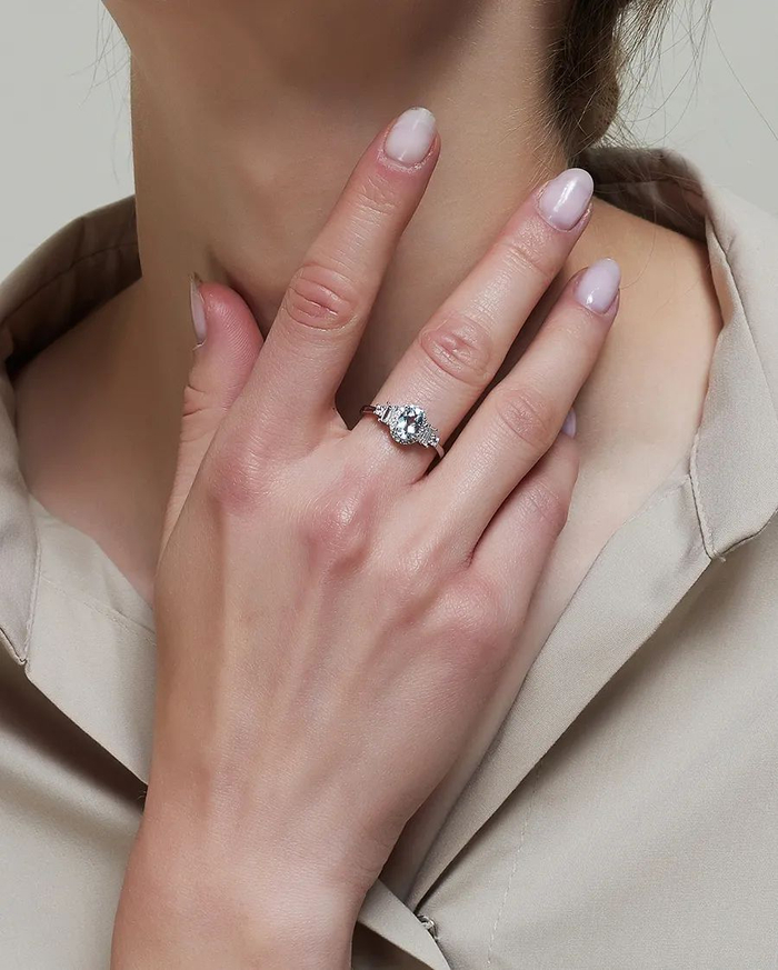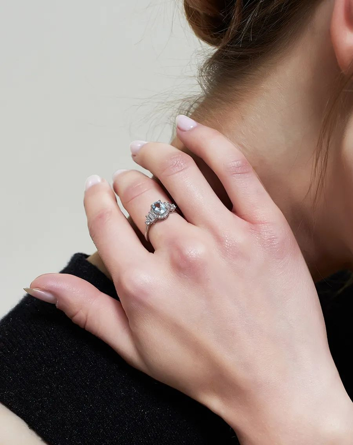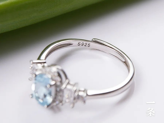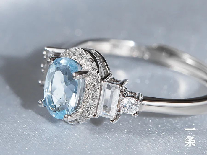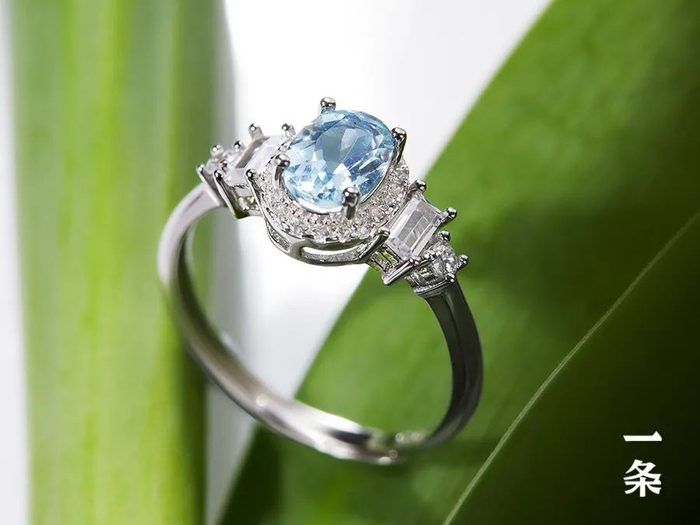 戒面一圈和两侧都镶嵌了白锆石,突显出海蓝宝的晶莹剔透,更让宝石显得大了一圈。
