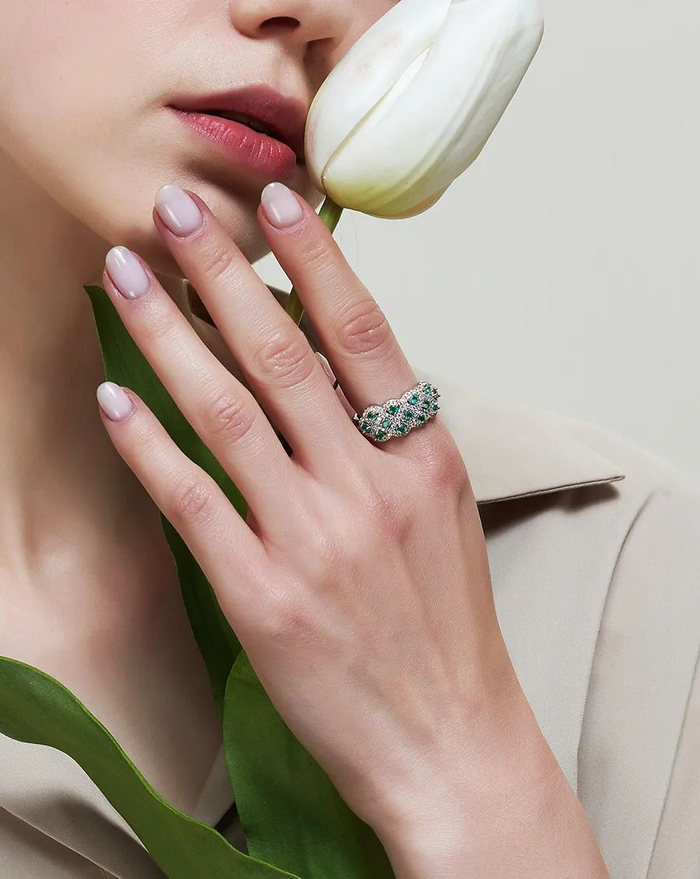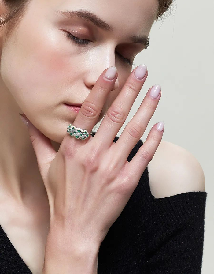 设计很独特的一枚戒指,打破常见祖母绿的优雅,带有强烈的时髦感。