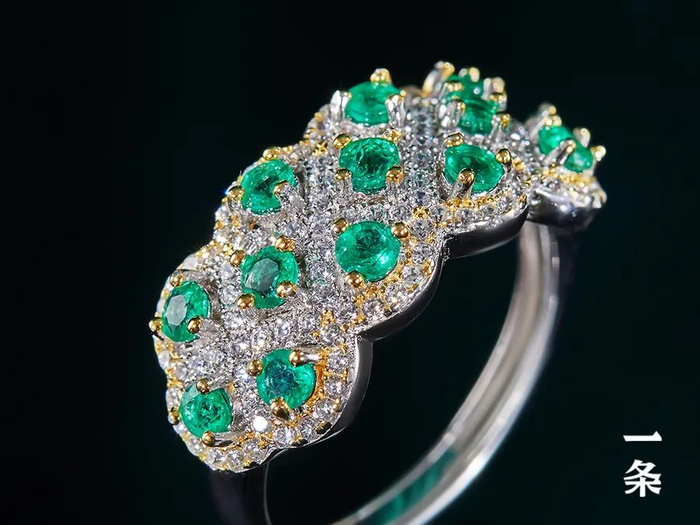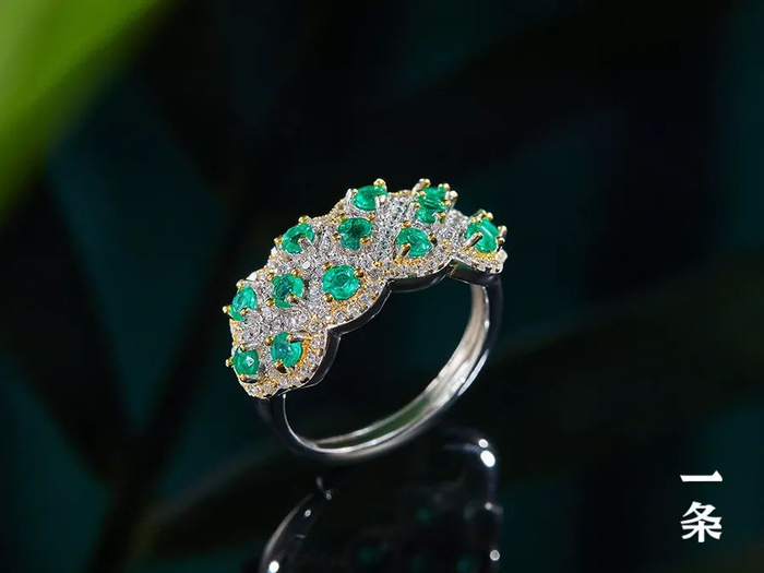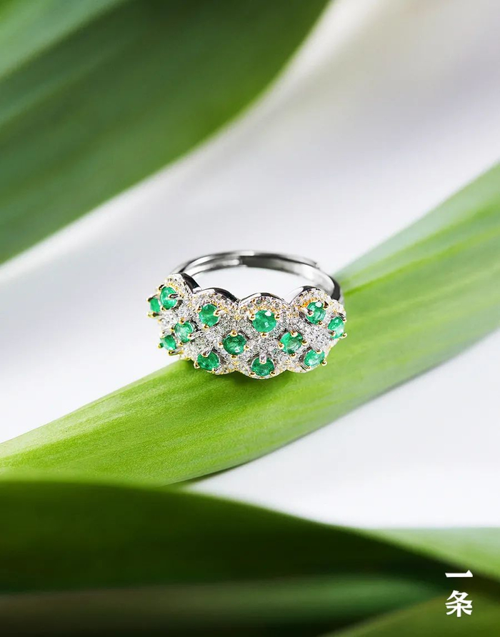 白锆石则带有耀眼火彩,衬托得祖母绿更为翠绿欲滴,整个戒面散发着粼粼波光。