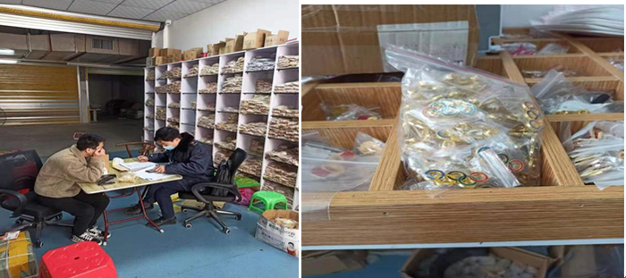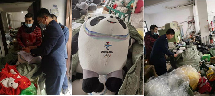 案例五:2021年11月23日,东阳市市场监督管理局根据金华市市场监管局案件线索依法对浙江凝**服装有限公司进行检查,发现该公司生产车间内堆放有自己生产的北京冬奥会吉祥物标志“”的“冰墩墩”80多个、标志“”“雪容融”半成品1000片。这些侵权产品一部分通过在网络平台的“妃***”网上销售代发产品,还有一部分通过在另一网络平台注册的义乌思*日用品有限公司销售。该案件由北京市公安局石景山分局于2021年12月8日立案,并于2022年1月1日依法拘留两家涉案公司法定代表人。