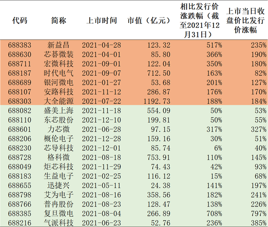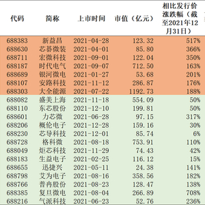 半导体公司更是科技型公司中“含金量”最高的一类。回顾2021年,一共有20只半导体公司登陆科创板,其中芯片设计公司复旦微电相比发行价翻了7倍、设备公司新益昌相比发行价翻了5倍,芯碁微装、宏微科技等均涨幅超300%。