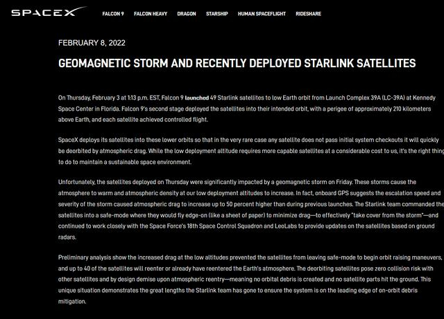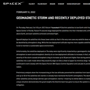 SpaceX称,每颗卫星都实现了受控飞行。然而,这批卫星次日就遭遇了一场严重的地磁暴,导致大气变暖并密度增加,大气阻力相较发射时急升50%。根据隶属于美国国家海洋和大气管理局的空间天气预报中心,此次地磁暴由1月30日一次太阳风暴引起,其产生的高能粒子流最终在2月2日抵达其近地轨道附近,最终造成地磁扰动。
